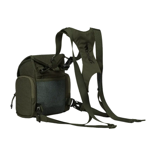 Magnetic closure bino pocket Fits up to 10x42 sized binoculars Quick release safety tethers 3 zippered storage zones Elastic...